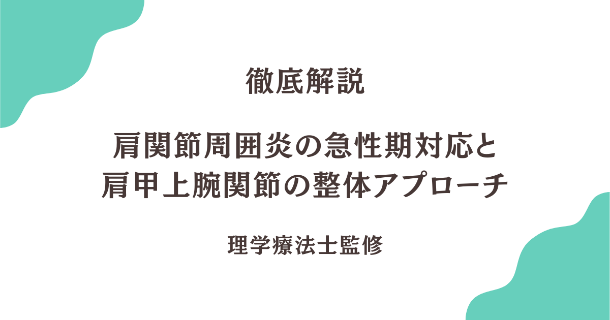 肩関節周囲炎の急性期における整体アプローチは、肩甲上腕関節の解剖学的理解と炎症段階の正確な評価に基づいて行う必要があります。急性期は炎症が最も強い時期であり、無理な施術は症状を悪化させるリスクがあります。