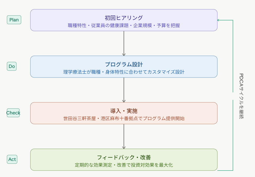 理学療法士コメント 「企業ごとに抱える健康課題は異なります。製造業では腰部・膝関節の負荷が多く、オフィスワーカーでは頸肩腕症候群や眼精疲労が多い傾向にあります。理学療法士が職種に合わせてプログラムを設計することで、予防効果を最大化できます。詳細はHabi Gymの専門スタッフへご相談ください(https://habifill.co.jp/)。」